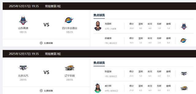 第3轮比赛将会从12月17日开始,持续到19日。本轮值得关注的比赛有,12月17日打2场,其中山东男篮主场对阵四川,邱彪要力拼新赛季首胜了。辽宁男篮则是客场挑战北京男篮,一场强强对话,不容错过。