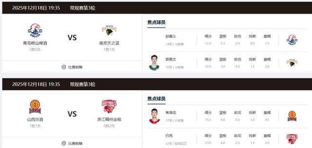 12月18日晚上有6场较量,值得关注的是青岛男篮主场迎战南京同曦,看看郭昊文面对家乡球队,是否还能延续神勇,山西男篮主场迎战浙江男篮。